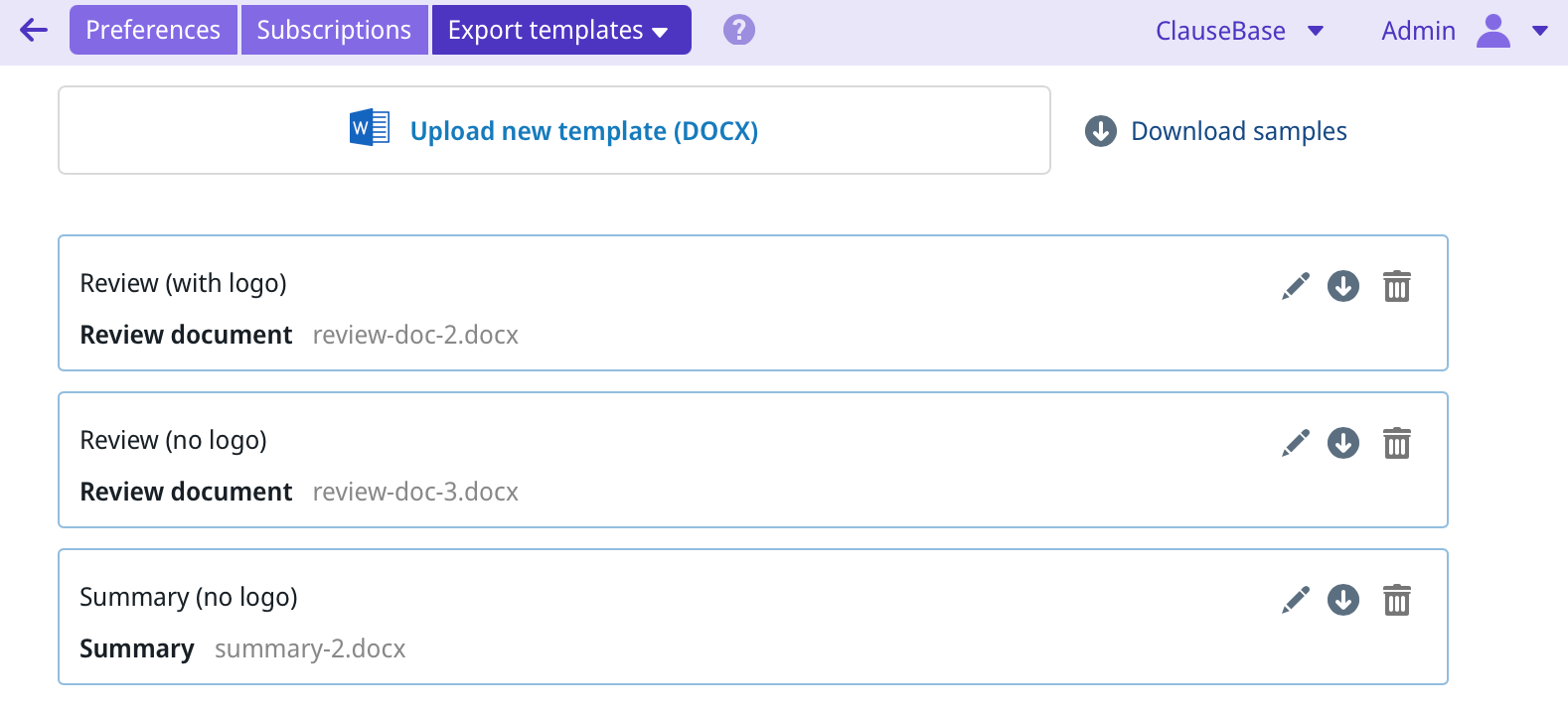 Through the Export Templates setting, you can upload Word (DOCX) documents that can be used as templates for reports exported from ClauseBuddy.&#x20;