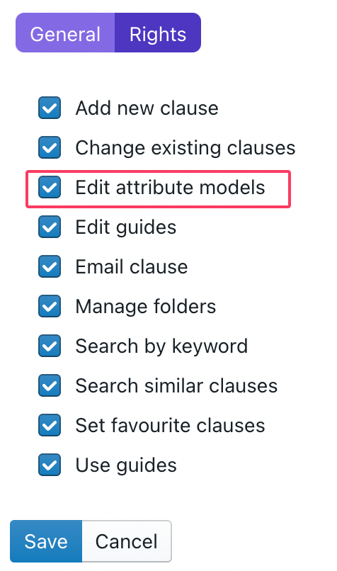 By default, in order to achieve some consistency across attributes, attribute models can only be created/managed by administrators. Once set up by the administrator, every user with clause editing rights can assign attributes to clauses.