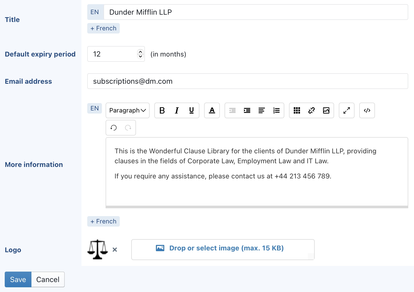 The Logo field allows you to upload an image (PNG or JPG) that will be shown int he top right corner of an end-user's ClauseBuddy. (Technical note: the software will scale the image to 25 x 25 pixels, but you are advised to upload a 50 x 50 pixel image, to account for high-resolution screens.)