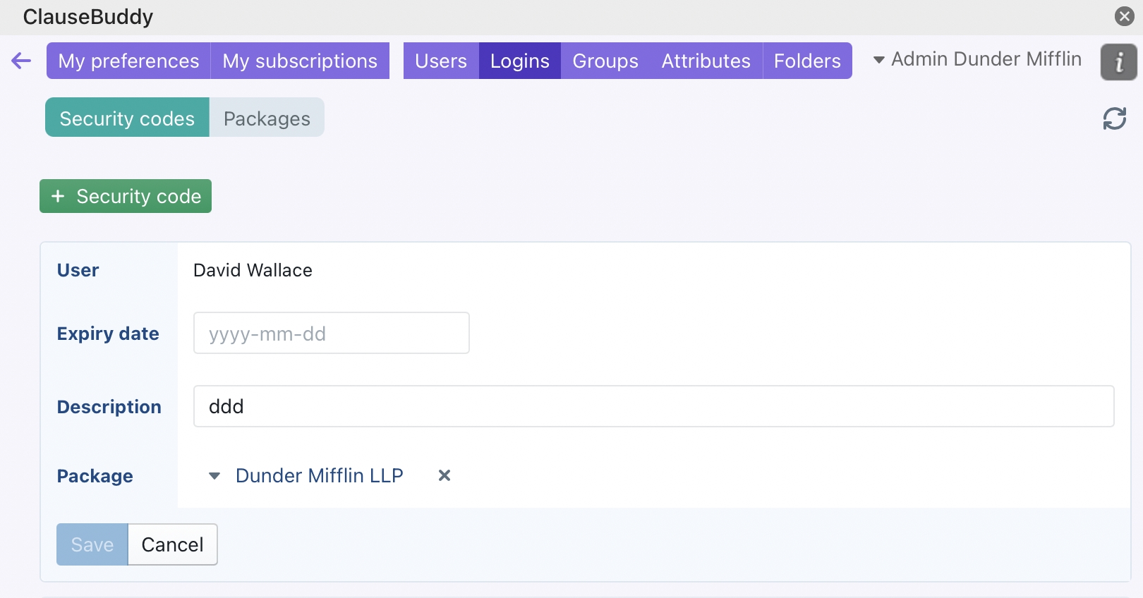External subscriptions allow you to provide security codes to external users. A typical use case is for a law firm to provide its clients with read-only access to (a subset of its) own clause libraries, or a legal publisher that publishes commercial subscriptions.