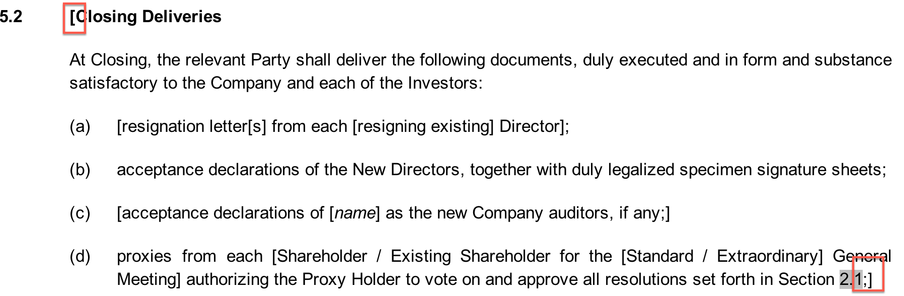 Options can even span across paragraphs, to indicate that entire blocks of text are optional. For example, the author of the following template designated the entire section 5.2 as optional through the opening square bracket at the very beginning of the first paragraph, and the closing square bracket at the very end: