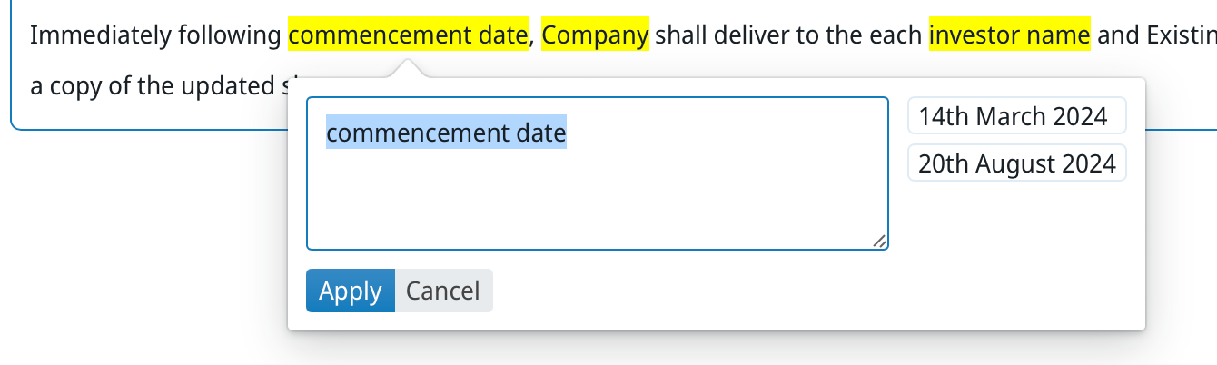 By simply clicking on a placeholder, end-users can replace the placeholder with an actual value. Bracketeer will remember your selections (in the screen below the dates in March & August), so you can quickly choose values by simply clicking with the mouse.