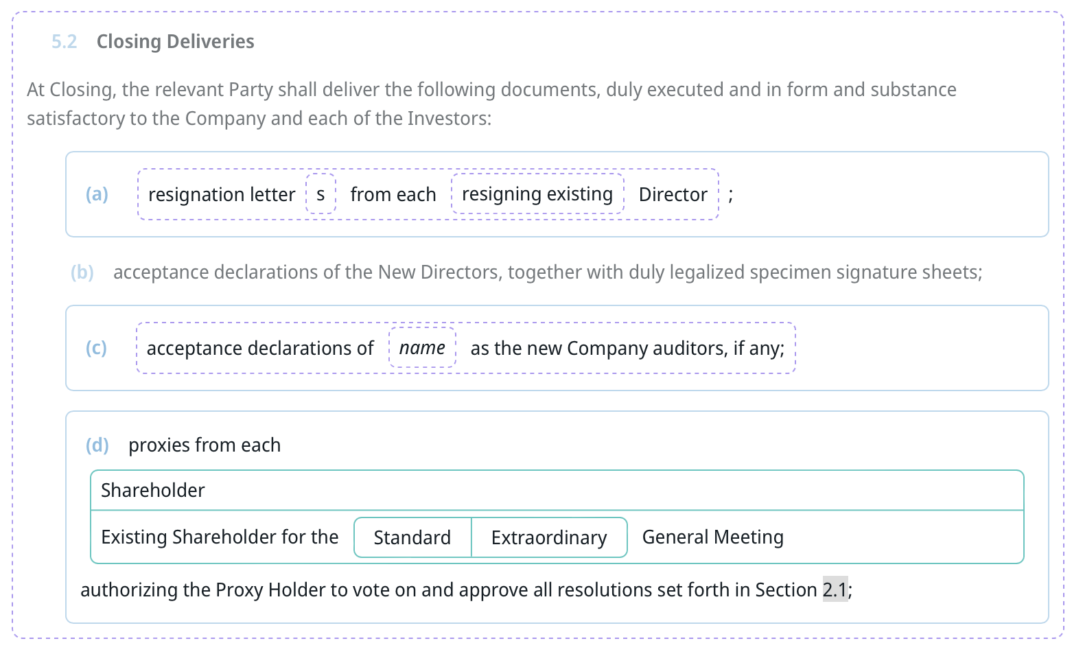 Options can also be nested within each other, typically two or three levels deep. For example, the following bullet is completely optional, because it is surrounded by square brackets. When the end-user would choose to keep this bullet, she can choose between (a) one or multiple resignation letters; and (b) "each Director" versus "each resigning existing Director".