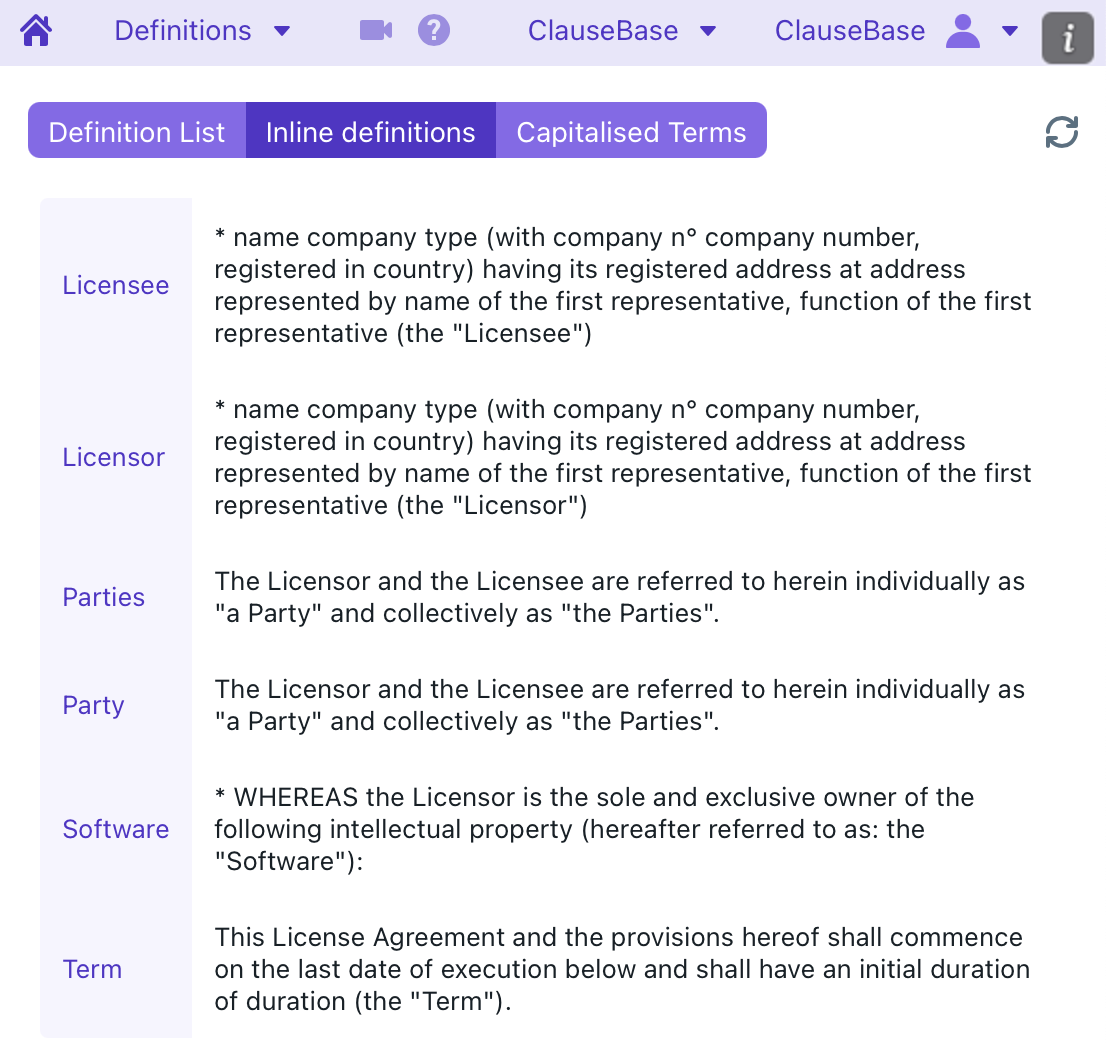 While mistakes may also happen in the Definition List and Inline Definitions, the likelihood of errors is significantly higher with the Capitalised Terms panel. To ensure that your document is analysed in seconds (instead of minutes), ClauseBuddy uses a special type of fast artificial intelligence (AI). This AI will make mistakes, e.g. flagging names of persons/cities as well as common words that humans would not qualify as defined terms.