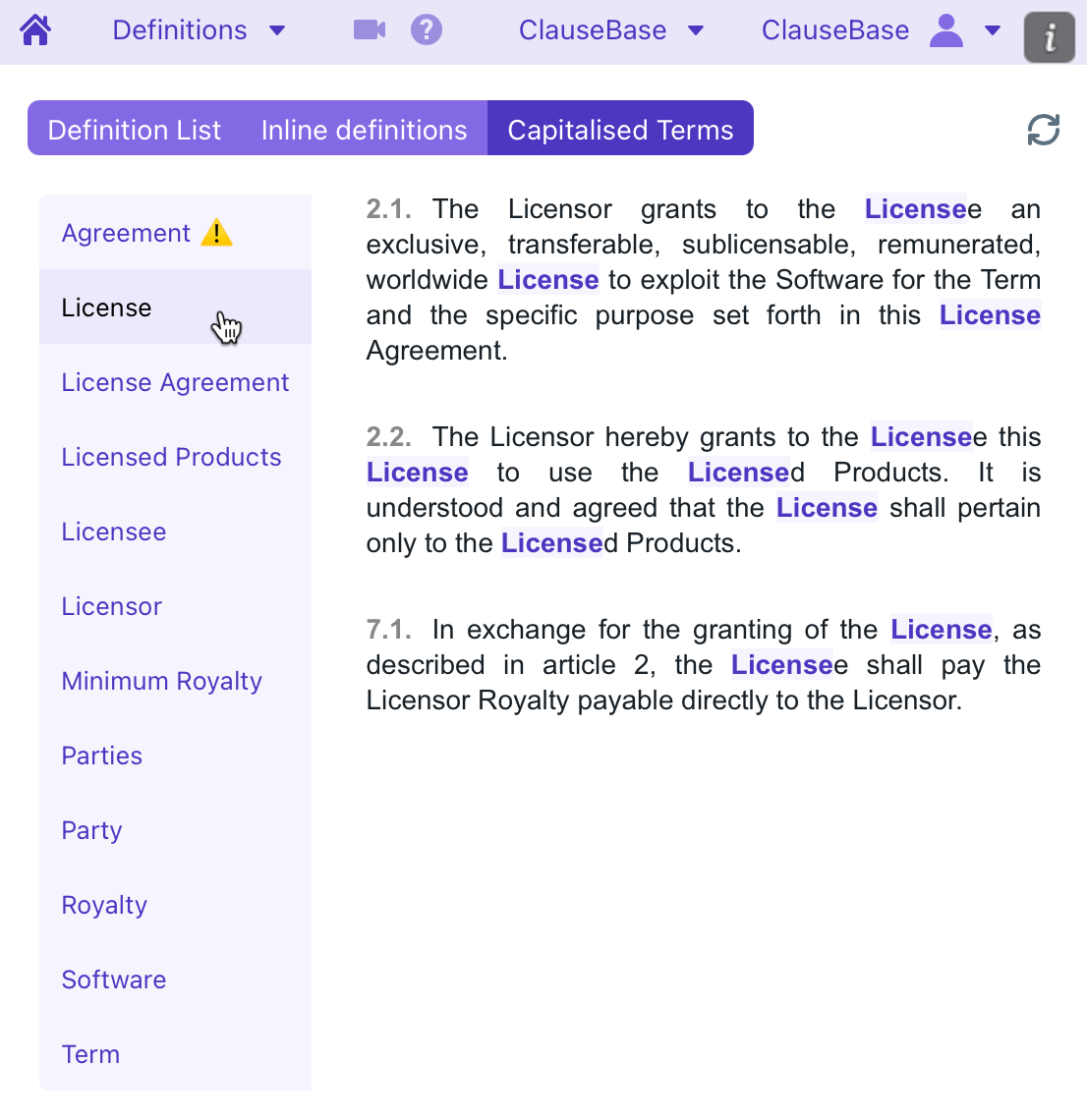 The Definitions feature presents a clean overview of all the definitions and capitalised terms in your document. This can help you to: