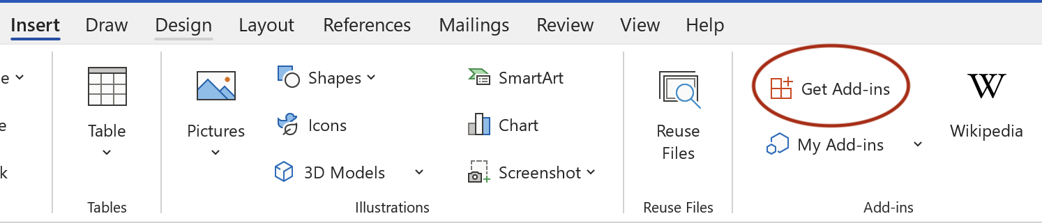 The installation is very similar to Microsoft Word: click on the Get Add-Ins button in your toolbar.