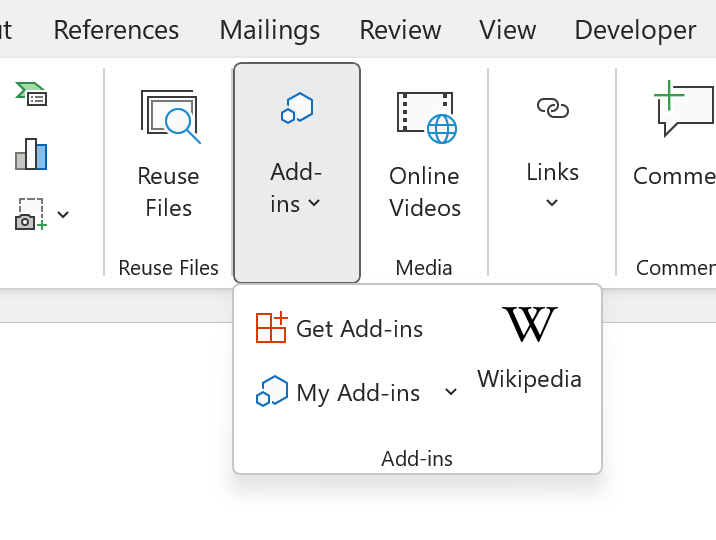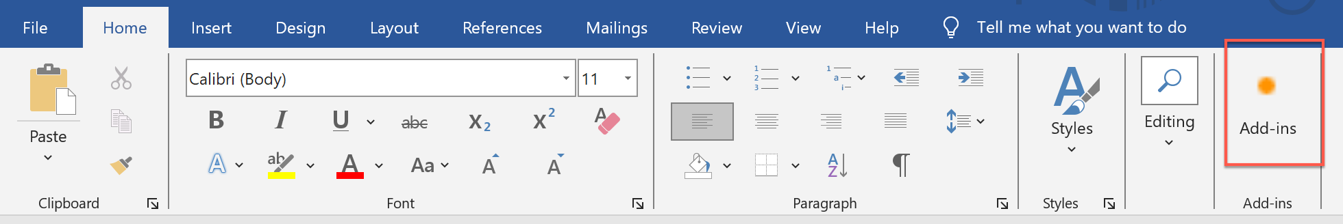 Similarly, on older versions of Word, it may be called Add-ins, located in the Home tab of the toolbar.