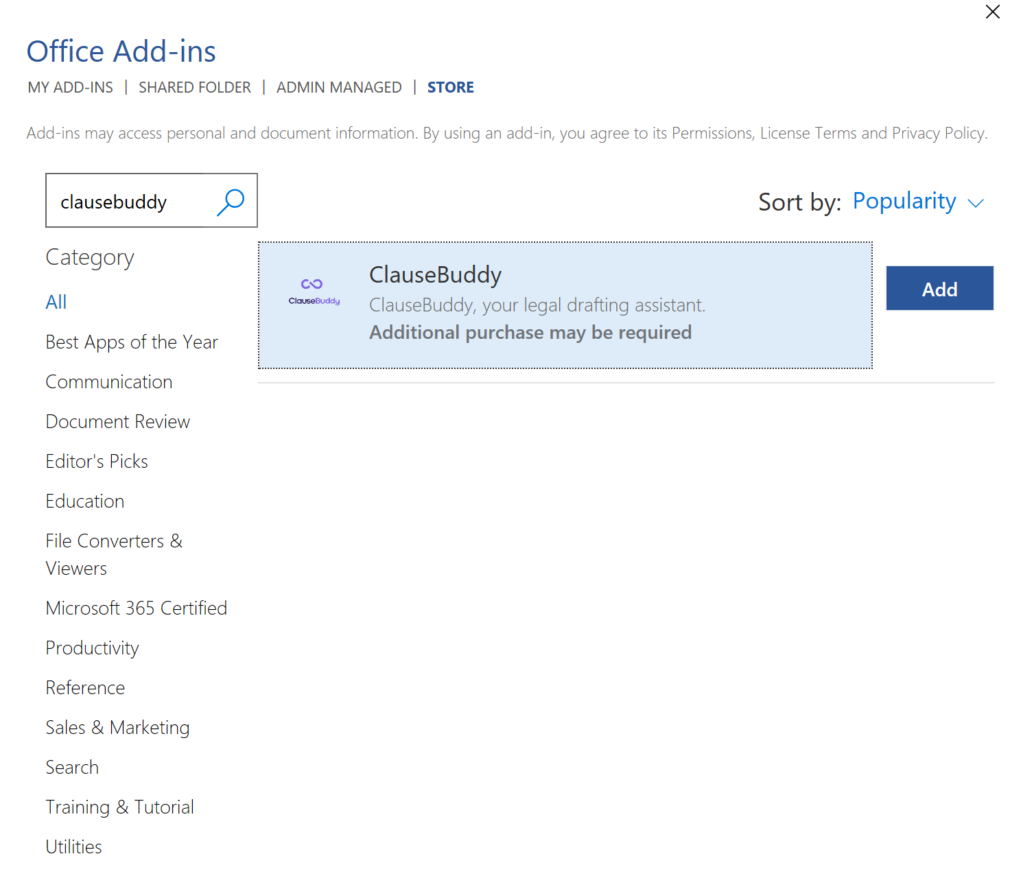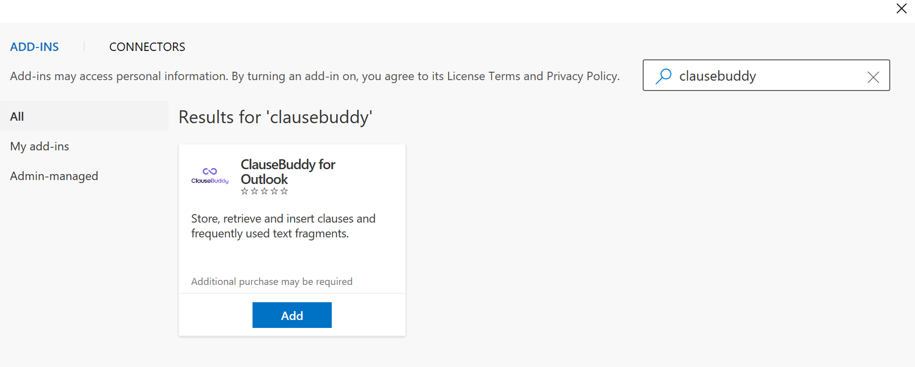 In the dialog box that appears, search for ClauseBuddy for Outlook, and click on Add.