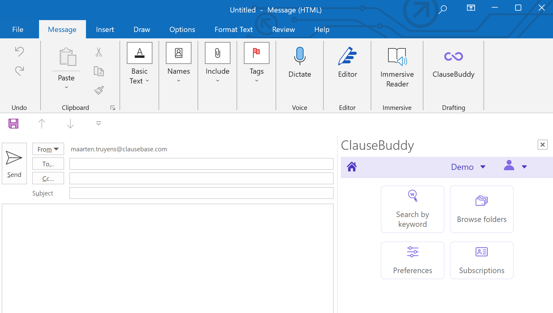ClauseBuddy will then be available by clicking on the button in your "Messages" toolbar when you draft a new email:
