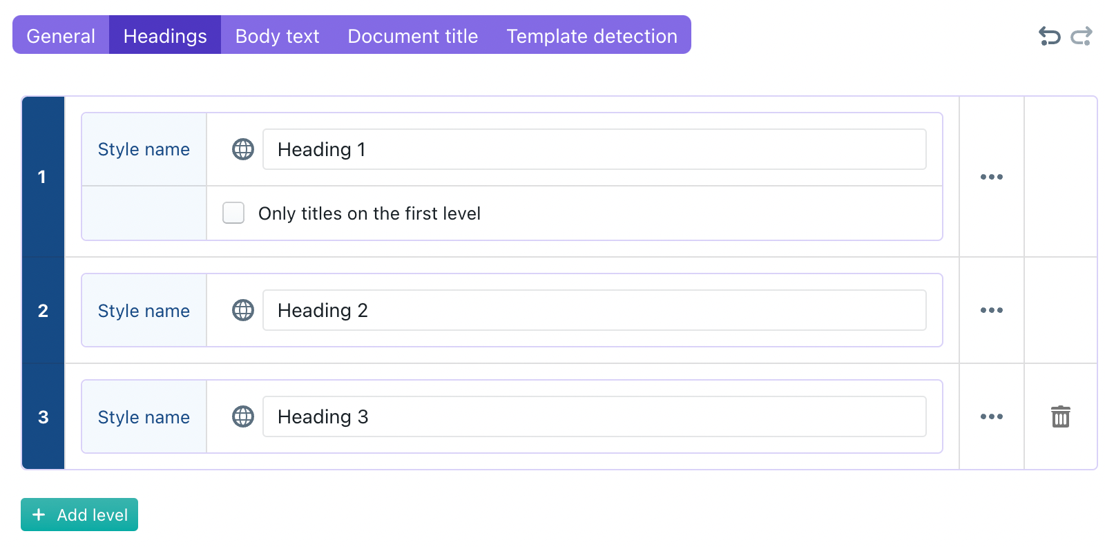 For each level, you can optionally assign a different MS Word style name for the title style. (If such separate title style name is missing, then the same MS Word style will be used for headings and heading titles on that level.)