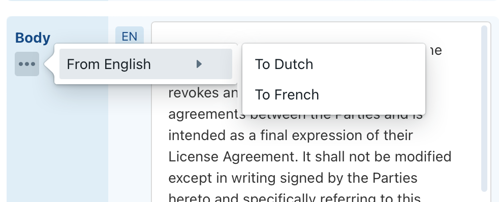 ClauseBuddy will automatically propose a translation if you add a new language version of a new or existing clause. You can also use the "..." button to insert a new translation.