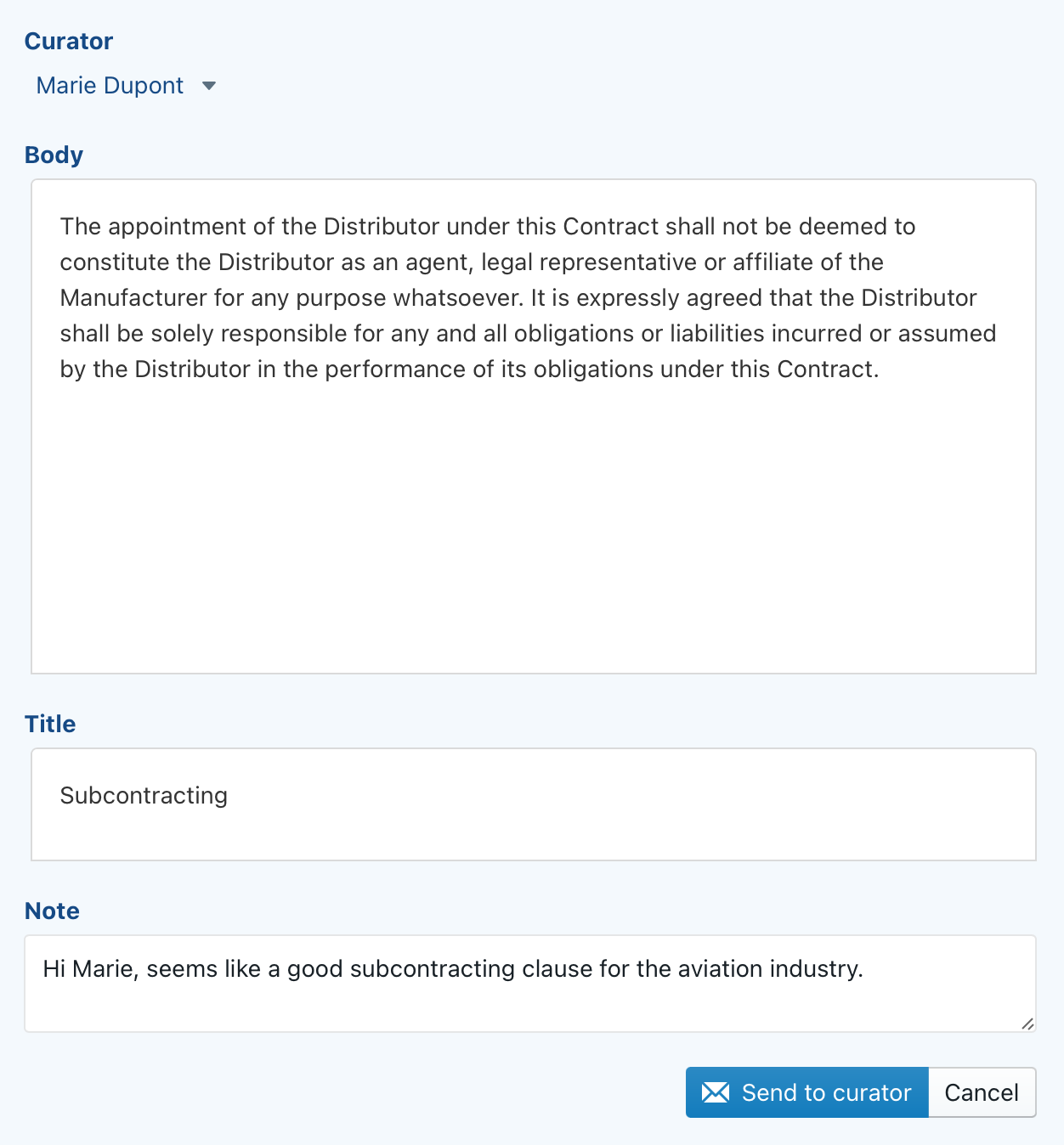 Tip: if you are a curator, you can also send a clause to yourself. This can come in handy when you stumble over an interesting clause, but do not currently have any time to spend on the curation of this clause.