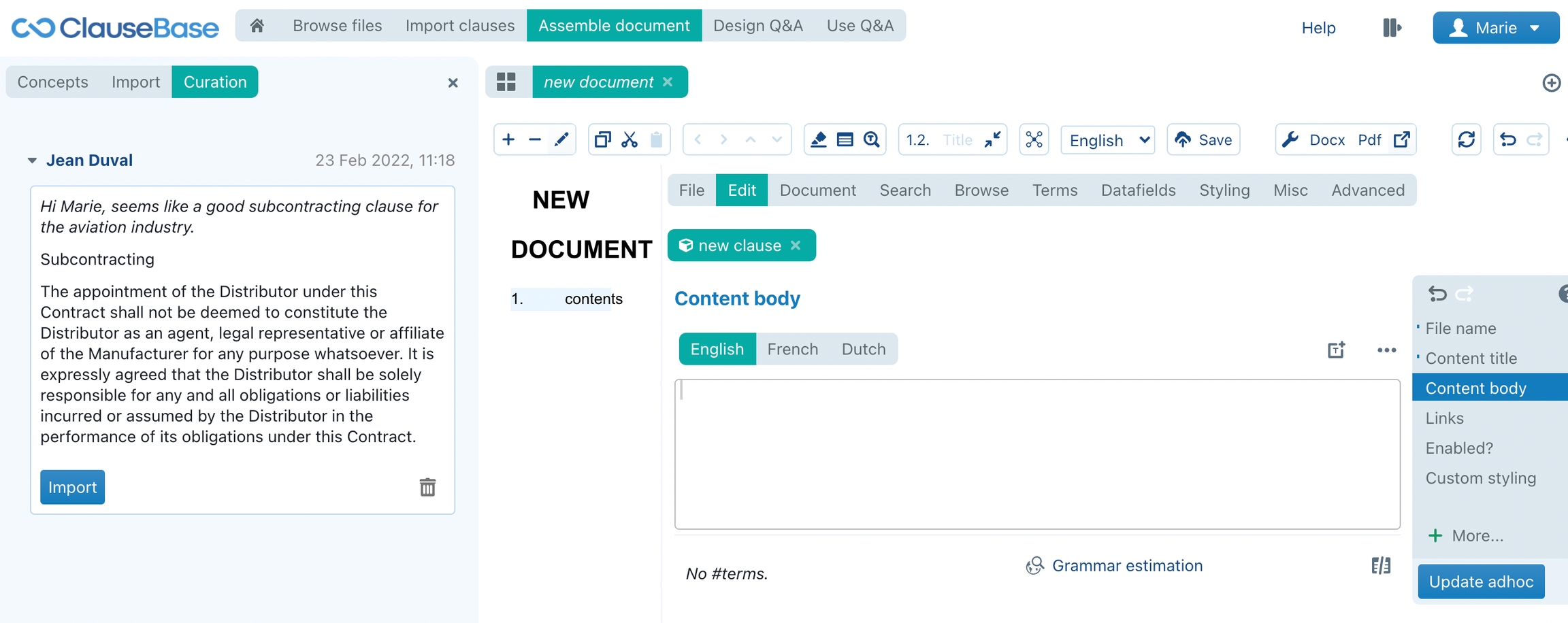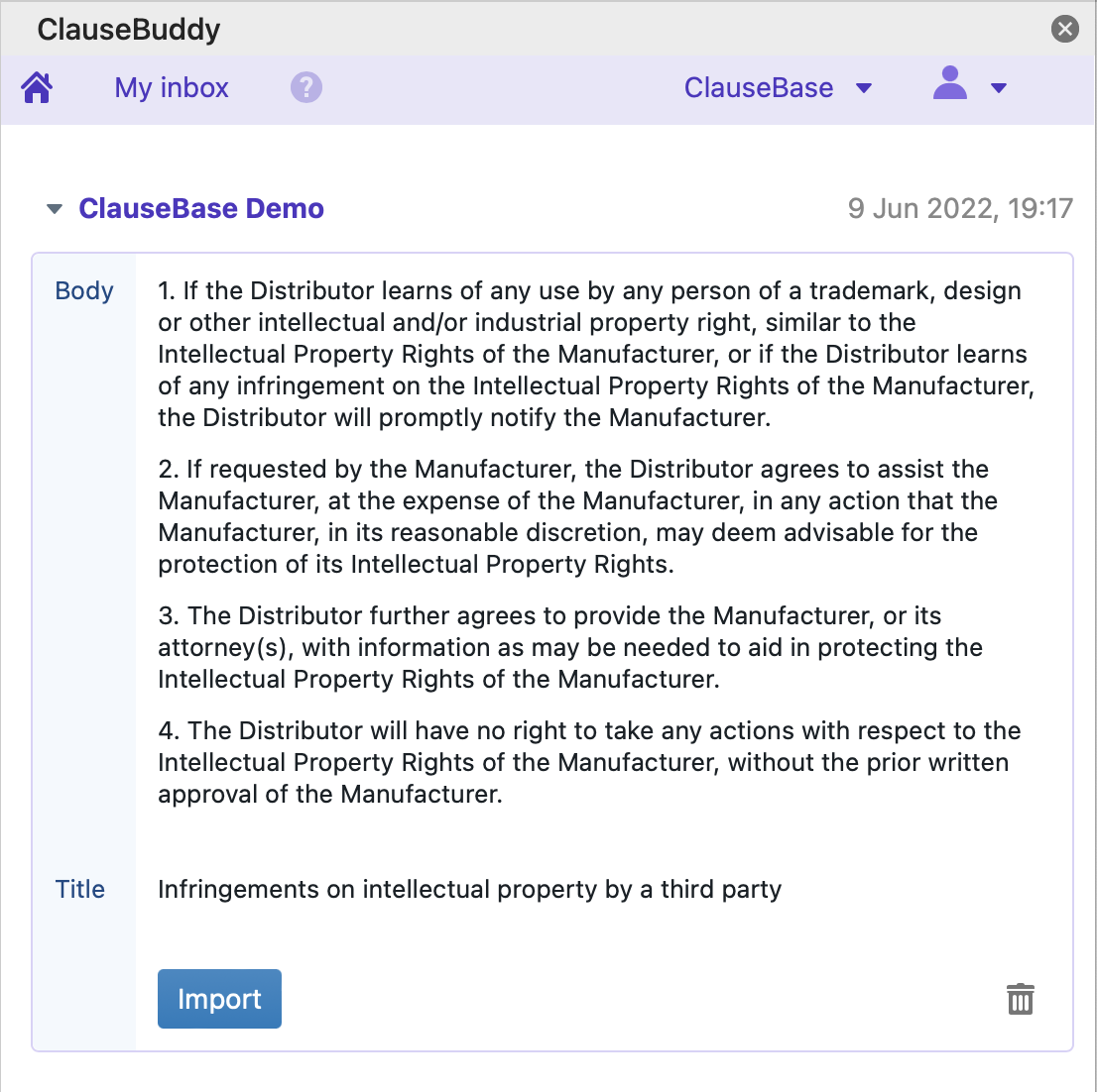 When you click on the Import button, the title and body will be transferred to the (relevant language box in the) Content body or Content title section of the clause editor in Clause9.