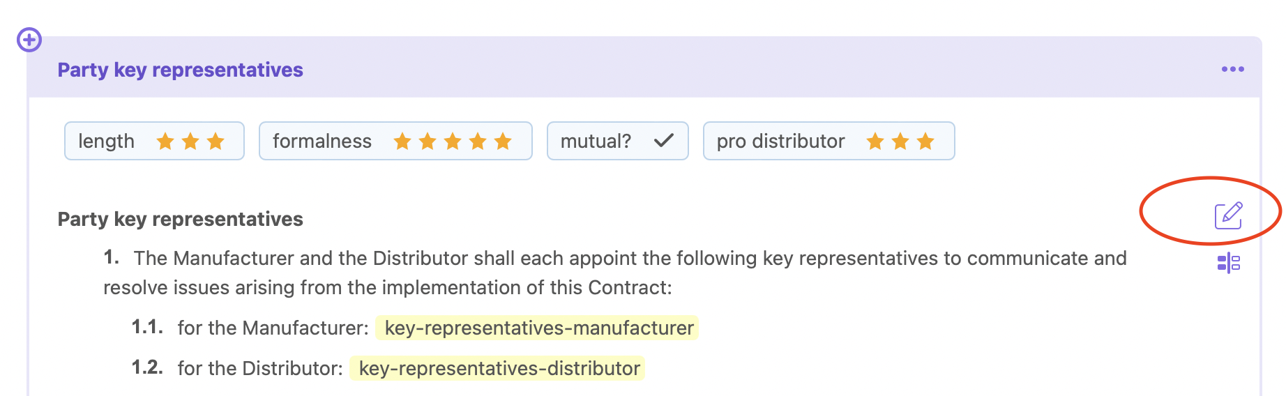 Finally, the Attributes field allows you to store and manage legal metadata regarding a clause — e.g. from which party's perspective a clause is written, how nuanced it is, whether it is treated as the organisation's standard clause, etc. Read all about it on our Attributes page.