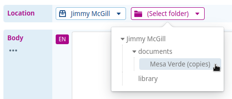 In the Location field you can specify in which search folder then (sub)folder a clause should be stored. Think carefully where you will store a clause, as the location provides a lot of legal context towards the users of your clause. Creating folder hierarchies is described in greater detail on the Managing Folders page.