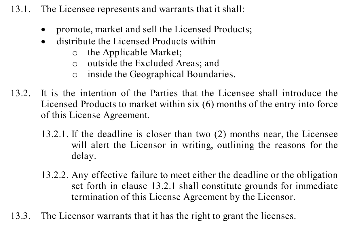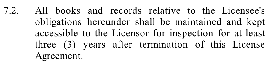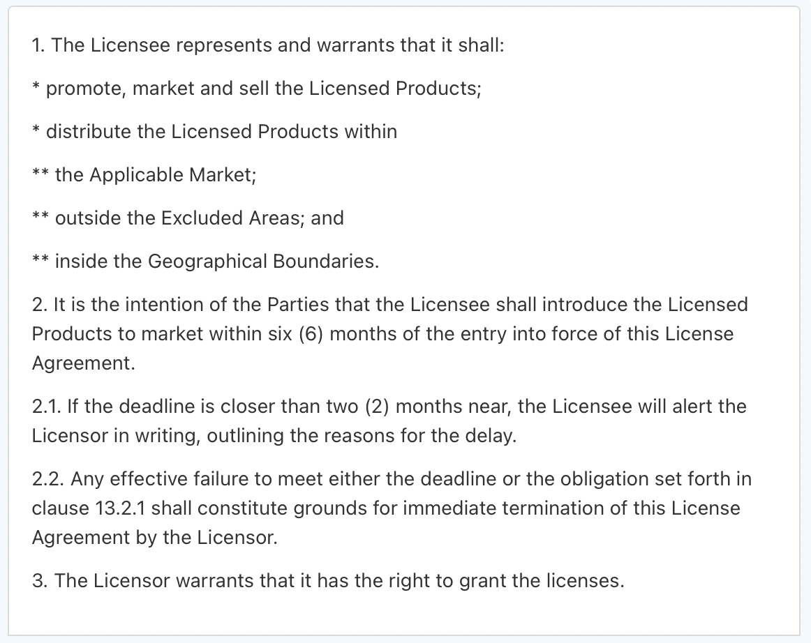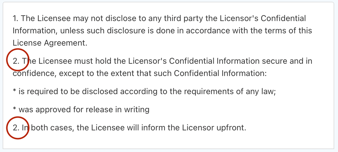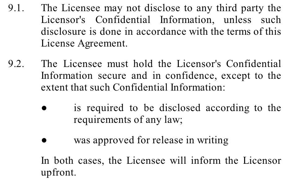 Sometimes you may want a paragraph to have the same indentation as a previous paragraph, while not receiving a certain number/bullet. For example, the last paragraph of 9.2 in the example below (In both cases...) is positioned at the same indentation level as the first paragraph of 9.2(The Licensee must hold...).