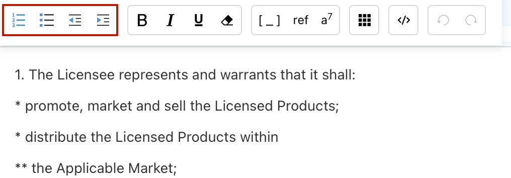 When you insert your cursor into the body or title section of a clause, a toolbar will automatically appear that allows you to apply numbering and formatting.