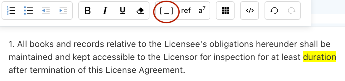 Inserting a placeholder is as simple as selecting some predefined text, and clicking on the placeholder button. For example, instead of "hard-coding" the duration of three years in the screenshot below...