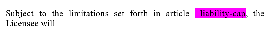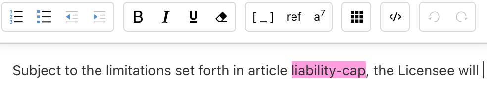Conversely, in a clause-based product such as ClauseBuddy, cross-references will need to be manually changed by the user. In order to alert the user that references will need to be manually changed, you can mark the reference in pink by clicking on the ref button.