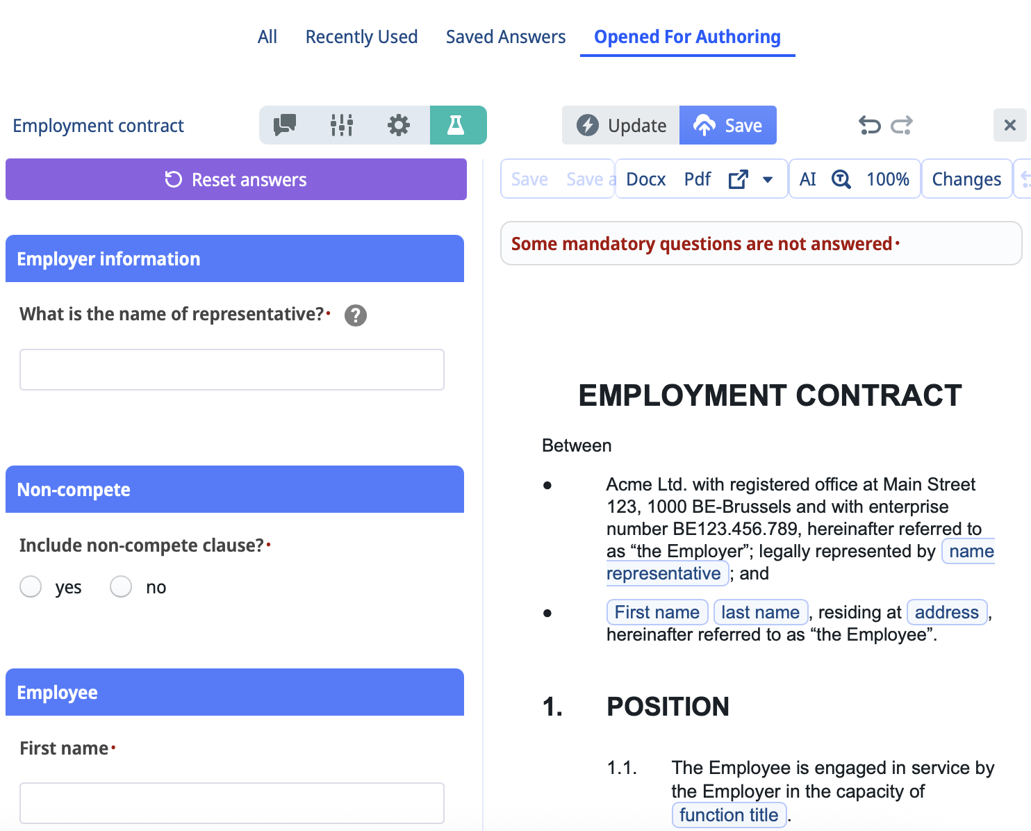 A Smart Template is built by combining highlighted text with interactive questions. The result: users only need to answer a short questionnaire to generate a complete, tailor-made contract.