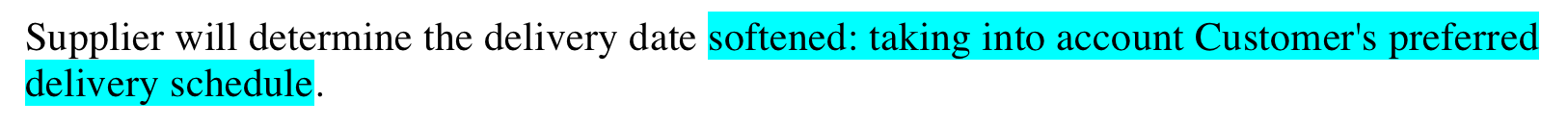 Conditional text is created by highlighting a condition + colon + conditional text. In the following example, the text "taking into account Customer's preferred delivery schedule" will only be shown when condition "softened" is met.