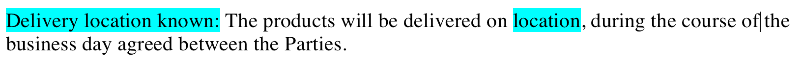 For example, assume that the delivery location is not known, so that the second paragraph will get dropped in the next example. When the end-user creates a PDF or DOCX file, ClauseBuddy will automatically update the numbering, so that the last paragraph ("Some subsequent paragraph") will get number 2.