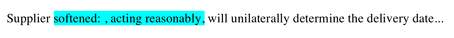 In the following example, the condition "softened" will cause softening language to get inserted. If that condition is not met (so that the ", acting reasonably," gets removed), you would end up with two consecutive spaces (one space exists after Supplier and one exists before will). In such scenarios, ClauseBuddy will automatically remove the double space.