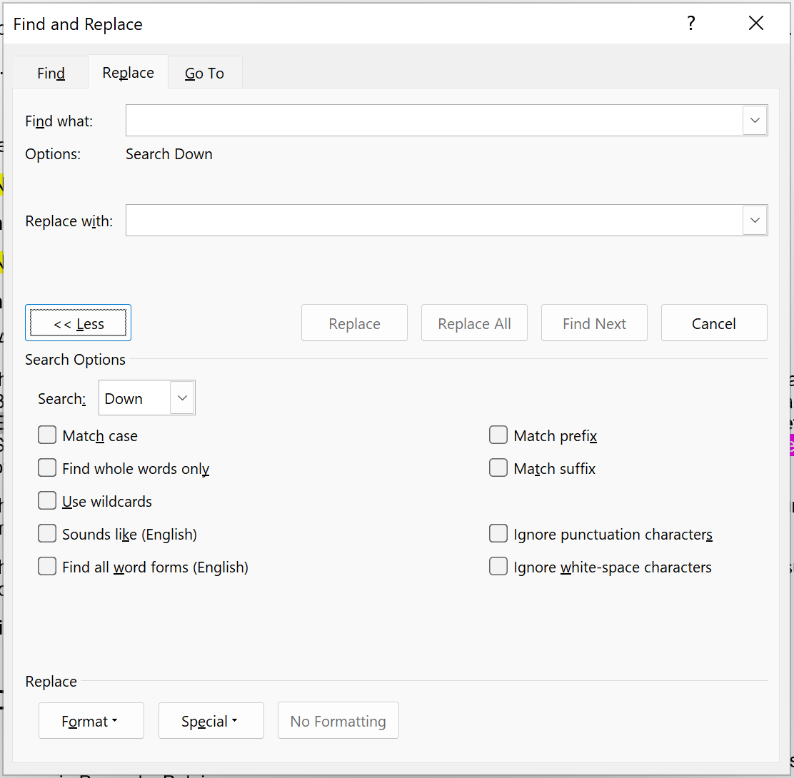 First off: you want to open the Advanced Find dialog box through Word's toolbar, navigate to the Replace part, and clock on >> More to show the entire dialog box.