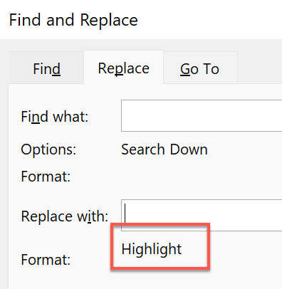 Next, you probably want to assign a cyan highlight to whatever you find. To make this happen, you have to insert your cursor on the Replace with part, click on the Format button at the bottom of the dialog box and activate Highlight. Your dialog box will then indicate that the highlighting is activated: