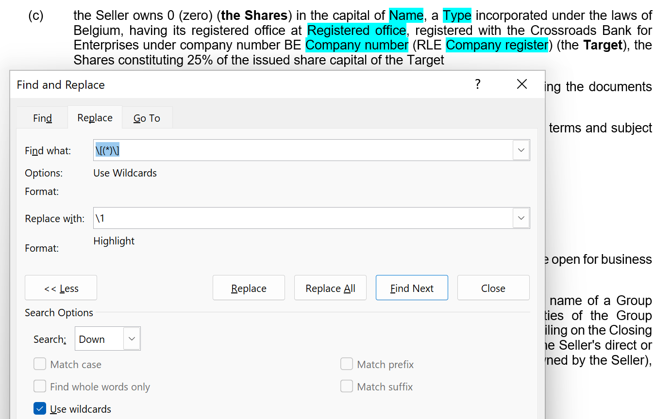 Also note that we did not insert any square brackets in the Replace with: part. For ClauseBuddy, you do not need anything to be surrounded with square brackets.