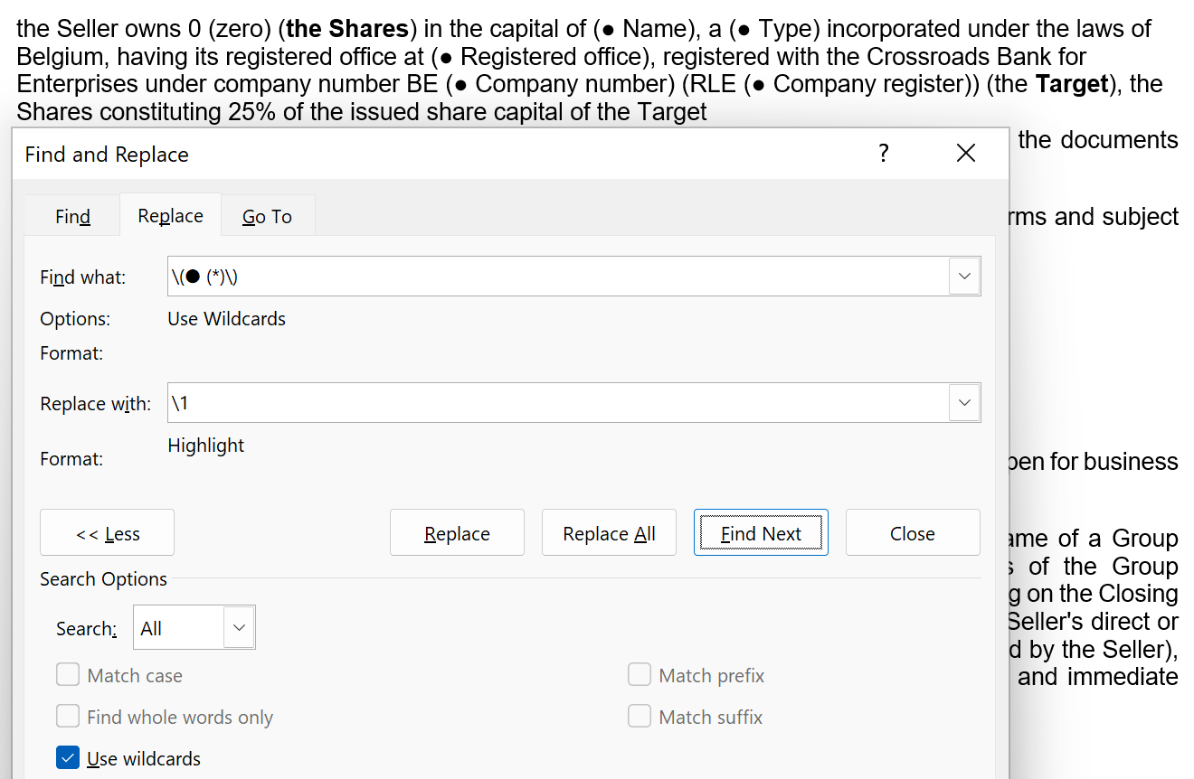 The next part is a bit more difficult: learning the special "wildcard" codes that Word makes available. With these special wildcards, you can find text with variable parts — e.g., to find all text between square brackets.
