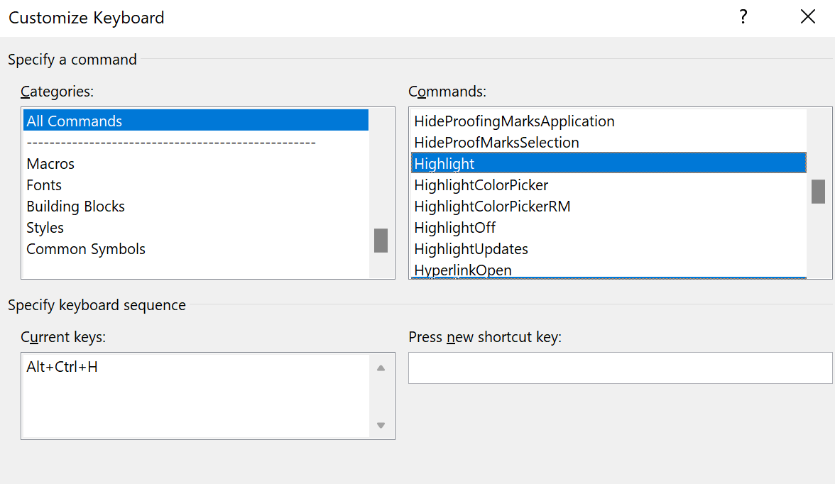 Another very helpful way to speed up the highlighting process, is by assigning keyboard shortcuts to the add highlight and remove highlight operations in MS Word. You can do so as follows: