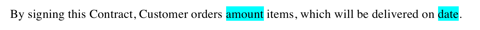 A placeholder is a piece of text that will get replaced by an answer to an associated question within the questionnaire. For example, in the following sentence, the order amount and the delivery date are placeholders, highlighted in cyan.