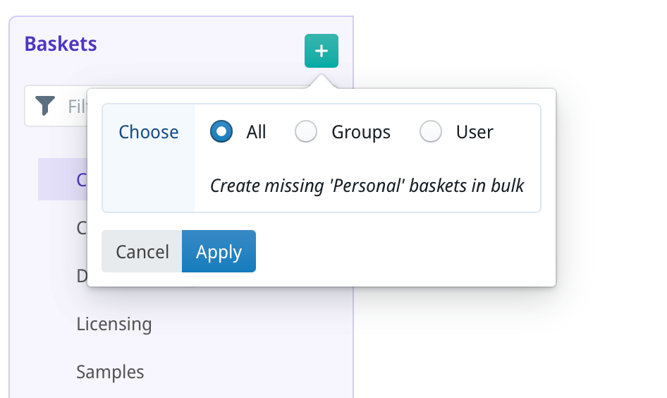 In the new popup-window that appears, choose either *All* (create the missing baskets for everyone), *Groups* (create them for a specific group of users) or *User* (create a Personal basket for one specific user).