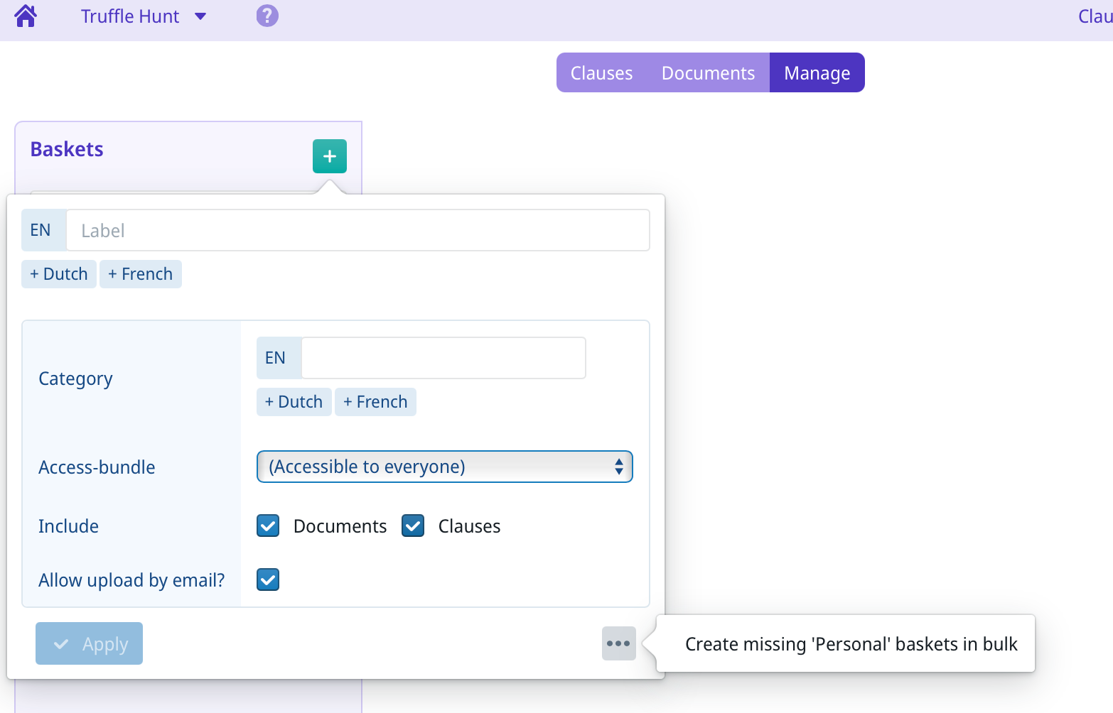 * In the **Access-bundle** box you should select an [access-bundle](https://help.clausebuddy.com/truffle-hunt/how/in-depth/broken-reference), to define who gets access to a certain locker/basket, and who can upload / remove documents from it. Users need "Read & Use" rights to search, and need "Edit" rights in order to upload or remove documents from a locker/basket. See also the selection below on personal baskets.&#x20;